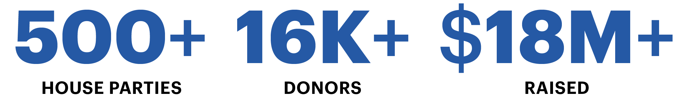 Since 2020, we have organized over 500 house parties and events, built a community of over 16,000 donors across the country, and raised over $18 million. These donations directly support trusted partner groups in key swing states working to combat voter suppression while educating and galvanizing their communities. Our partner groups register and inspire millions of voters who tip the balance toward Democratic victories in crucial geographies.